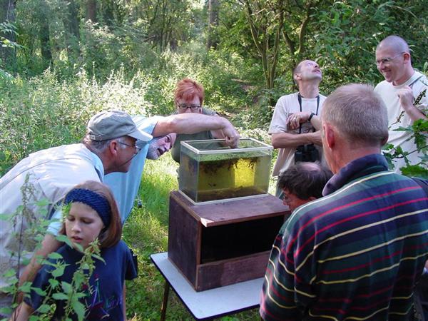 Op deze zondag in het midden van de vakantie besloten we, aangezien we slechts met een kleine groep van 8 mensen waren, de poelen eens aan een nader onderzoek te onderwerpen en aldus werd een aquarium en een schepnet bovengehaald (lees gevist). In de poel aan de materiaal keet wemelde er het van het leven. Bij elke schepbeurt had men meerdere exemplaren mee van kleine watersalamander of alpenwatersalamander. Ook larven van libellen waren overvloedig aanwezig. Verder konden we kennis maken met bootsmannetjes, waterschorpioenen (zowel volwassen dieren als nimfen), schaatsenrijders, waterpissebedden. Ook heel wat andere waterkevers waren aanwezig. Eéntje ervan, sprong onmiddellijk in het oog door zijn grote afmetingen ( 4 cm) , nl de geelgerande watertor, een zeer gevreesde waterroofkever. Groene kikker liet zich ook maar al te graag bewonderen. Overal waren er eveneens kleine exemplaren waar te nemen.