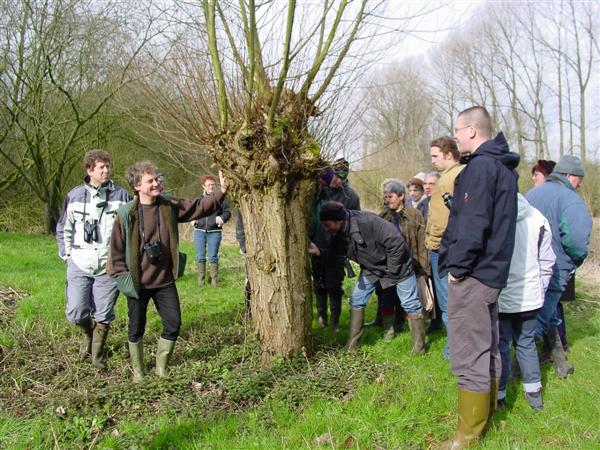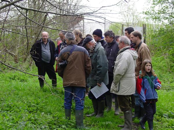Deze wandeling en opendeurdag vielen dit jaar samen met Pasen. Daarenboven was er de wielerwedstrijd Parijs-Roubaix. Dit alles deed ons een beetje vrezen voor het bezoekersaantal... Maar in totaal kwamen toch nog maar liefst 46 mensen langs om te genieten van een stukje natuurpracht. Er waren reeds heel wat vogelgeluiden te horen zoals van de koolmees, pimpelmees, zwartkop, hier en daar het geroep van de groene en grote bonte specht. Een wilde eend vluchtte met haar jongen dieper weg in de populierenpoeL Maar vooral de lentebloeiers trokken de aandacht, zoals de bosanemoon, slanke sleutelbloem, echte sleutelbloem. Verschillende bloemen vormden een prachtig beeld in de dreef : het blauw van de overblijvende ossetong, geel van gele dovenetel en stinkende gauwe, en het wit van fluitekruid. In de nattere gedeelten stonden volop dotterbloem en pinksterbloem. Deze laatste trokken hier en daar de eerste oranjetipjes aan en weldra zal ook het look-zonder-look daarbij helpen. Opvallend verder de in uitbreiding zijnde bosanemonen en uiteraard de paarse schubwortel.
